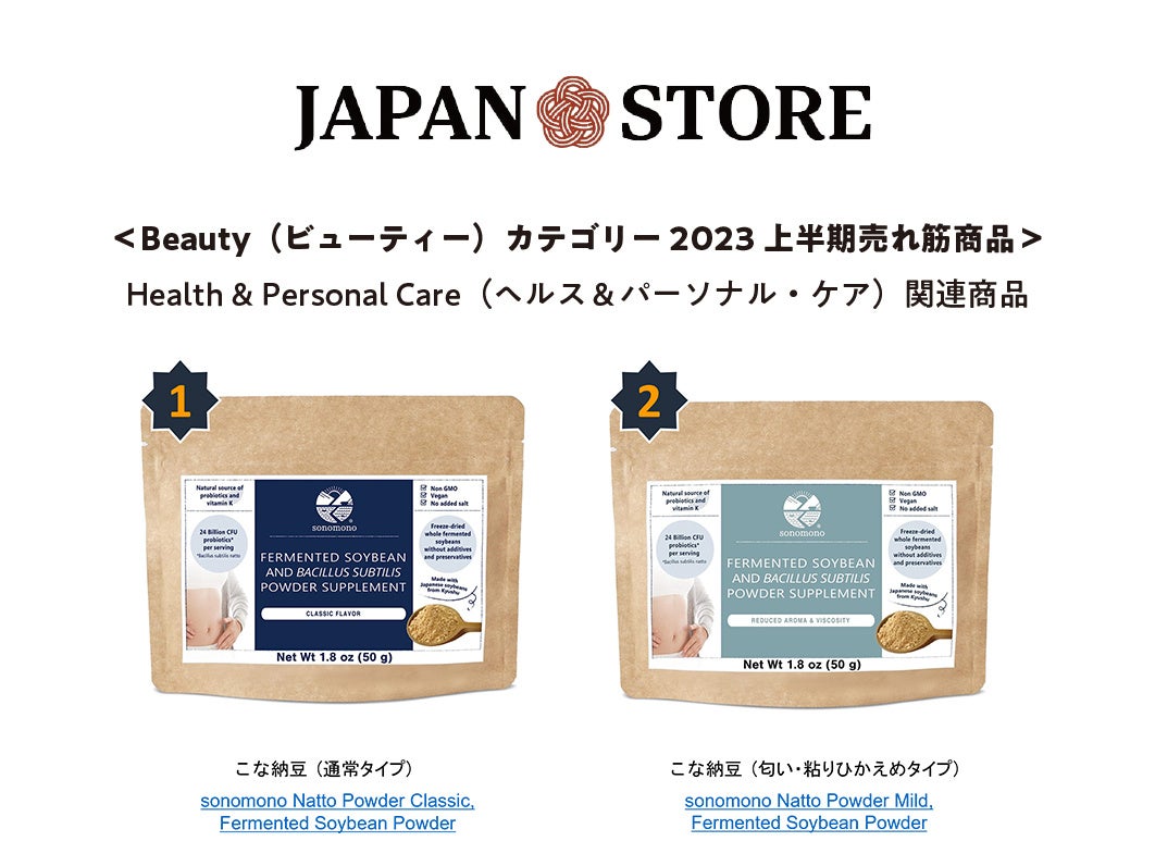 sonomono Corporation’s international expansion efforts garnered widespread acclaim, featured prominently on NHK’s “Ohayo Nippon” on July 24, 2023, and broadcasted globally. The “Sonomono Natto (Capsules)” and “Powdered Natto” were spotlighted as innovative natto offerings tailored to suit diverse palates worldwide. With consistent annual sales growth, they clinched the top positions in the Beauty category of the US Amazon Japan Store 2023 First Half Rankings.